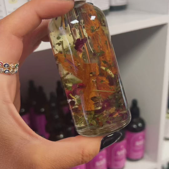 Sunflower Oil, Dilute Rose Essential Oil, Patchouli Essential Oil, Ylang Ylang Essential Oil, Vanilla Essential Oil, Grapefruit Essential Oil, Dried Rose Petals, Dried Raspberry, Dried Cinnamon & Reiki-Infused Rose Quartz.